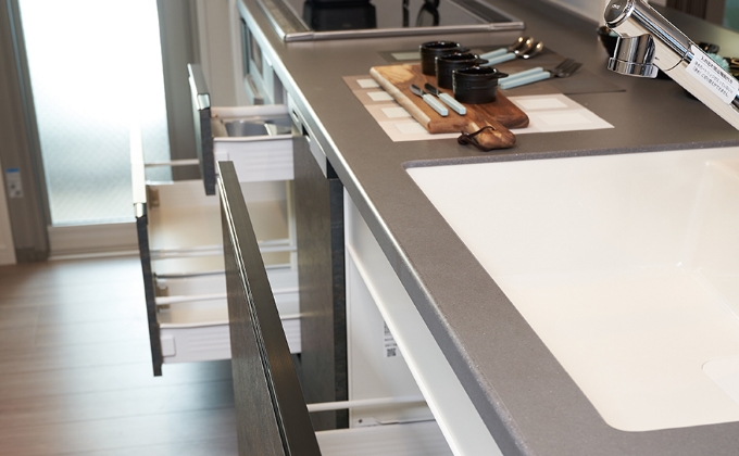 システムキッチン下部の収納は、引き出したときに内部がすべて見えるオールスライド式。何がどこにあるかがひと目でわかります。